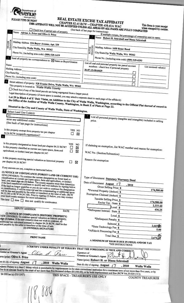 | 3 | 08/20/2010 | WARRANTY D | WARRANTY DEED | PRICE, ADRIAN A & OLIVE S | SCHREINDL, ROBERT & DIANA | | | $174,500.00 | 118886 | 2010-06444 |
