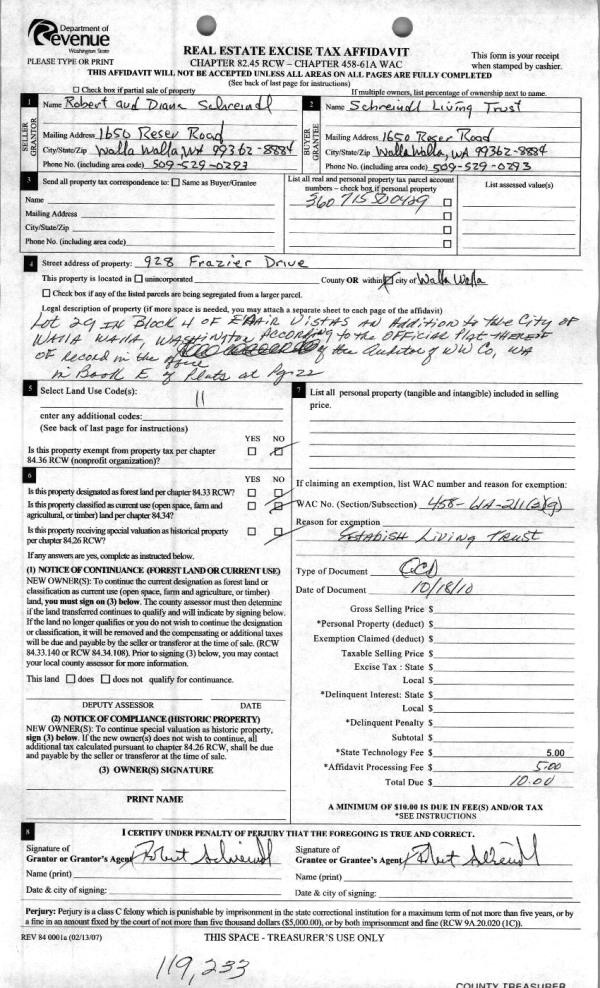 | 2 | 10/22/2010 | QCD | QUIT CLAIM DEED | SCHREINDL, ROBERT H & DIANA | SCHREINDL LIVING TRUST | | | | 119233 | 2010-08584 |