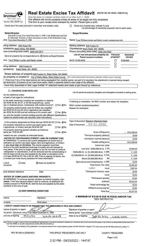 | 1 | 09/23/2022 | SWD | STATUTORY WARRANTY DEED | SCHREINDL LIVING TRUST | LECLAIR TRENT WILLIAM & DARBY | | | $315,000.00 | 144747 | 2022-07952 |