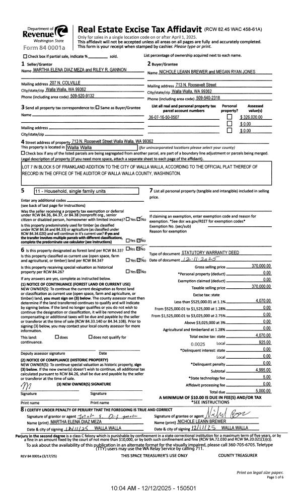 | 1 | 12/12/2025 | SWD | STATUTORY WARRANTY DEED | DIAZ MEZA MARTHA ELENA | BREWER NICHOLE LEANN & MEGAN RYAN JONES | | | $370,000.00 | 150501 | 2025-07626 |
