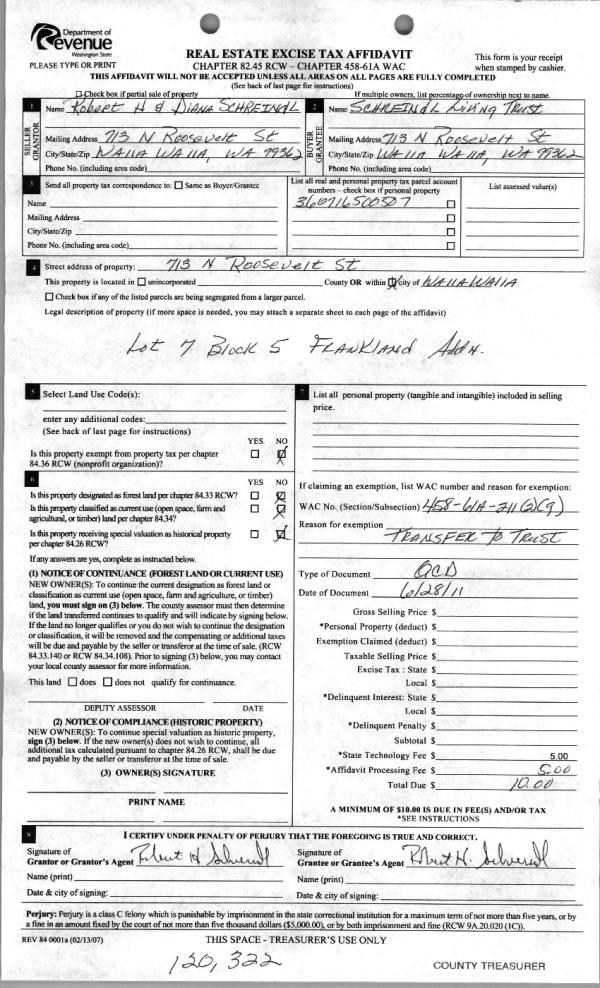 | 3 | 06/29/2011 | QCD | QUIT CLAIM DEED | SCHREINDL, ROBERT H & DIANA | SCHREINDL LIVING TRUST | | | | 120322 | 2011-05004 |