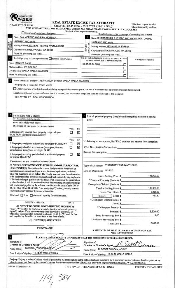 | 6 | 11/29/2010 | WARRANTY D | WARRANTY DEED | MORENO, DAX J & ERIN M | FLIPPO, CHRISTOPHER R | | | $185,000.00 | 119384 | 2010-09790 |