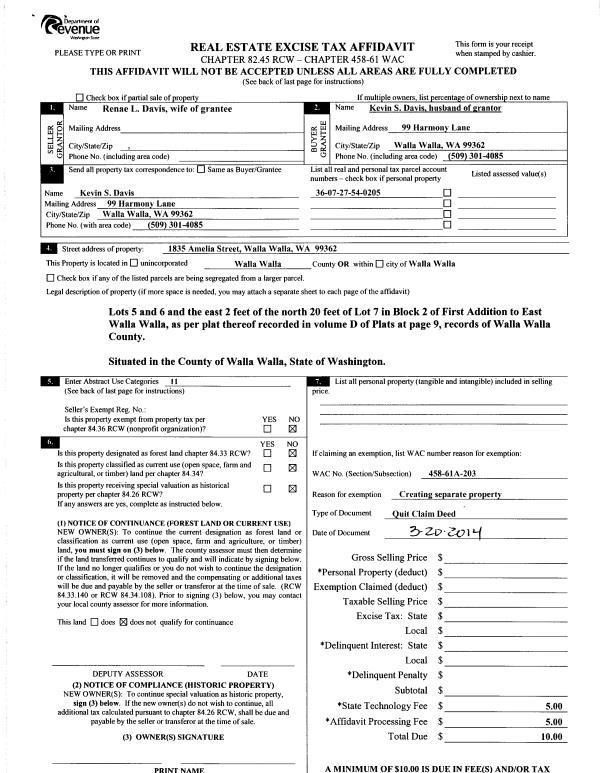 | 3 | 03/21/2014 | QCD | QUIT CLAIM DEED | | DAVIS KEVIN S | | | | 125599 | 2014-01928 |