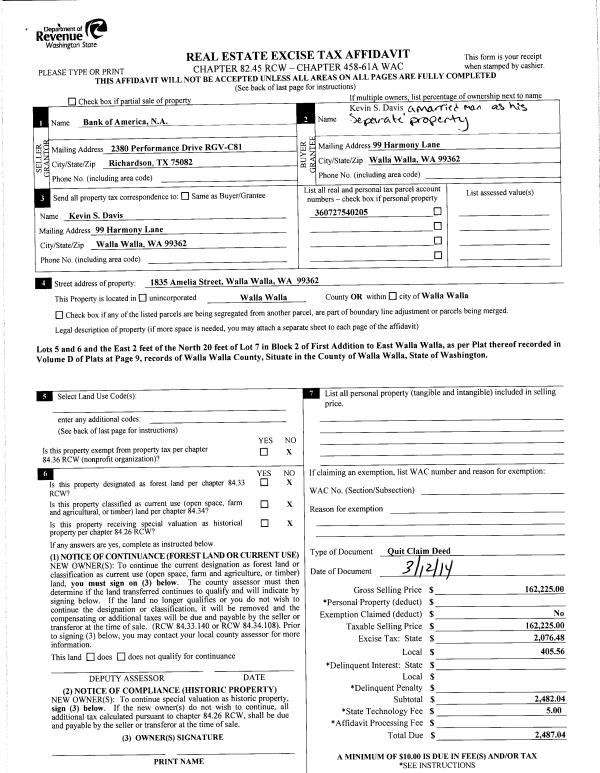 | 4 | 03/21/2014 | QCD | QUIT CLAIM DEED | BANK OF AMERICA | DAVIS KEVIN S | | | $162,225.00 | 125600 | 2014-01929 |