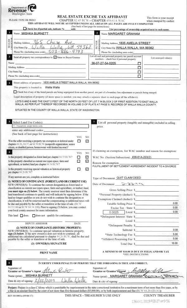 | 1 | 02/22/2019 | QCD | QUIT CLAIM DEED | BURNETT MISHKA | GRAHAM MARGARET | | | $0.00 | 136441 | 2019-01262 |