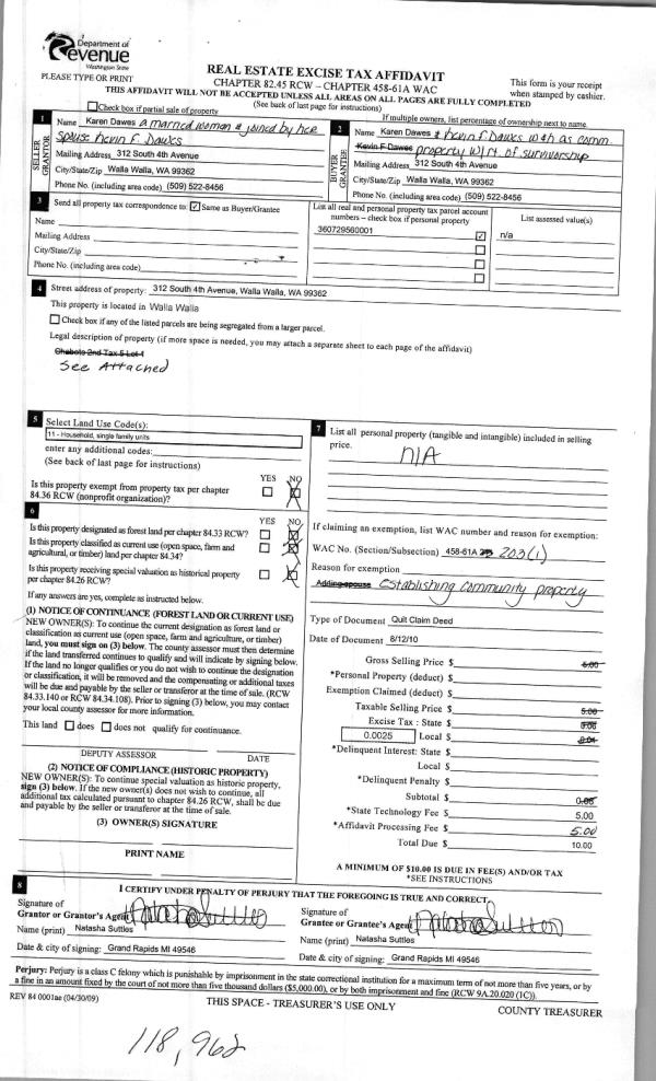 | 2 | 09/02/2010 | QCD | QUIT CLAIM DEED | DAWES, KAREN | DAWES, KEVIN & KAREN | | | | 118962 | 2010-06900 |