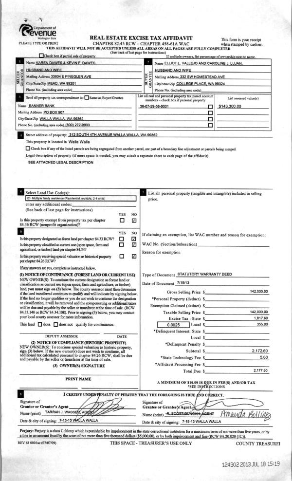 | 1 | 07/18/2013 | WARRANTY D | WARRANTY DEED | DAWES, KEVIN & KAREN | VALLEJO, ELLIOT | | | $142,000.00 | 124302 | 2013-07228 |