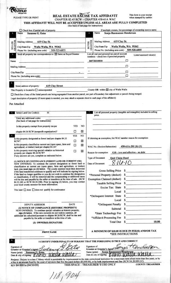 | 2 | 08/24/2010 | QCD | QUIT CLAIM DEED | ESTES, SUSANNE G | HENDERSON, SONJA RASMUSSEN | | | | 118904 | 2010-06554 |