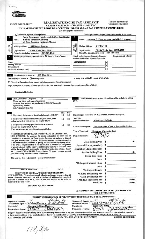 | 3 | 08/10/2010 | WARRANTY D | WARRANTY DEED | HENDERSON, SONJA RASMUSSEN LLC | ESTES, SUSANNE G | | | | 118846 | 2010-06187 |