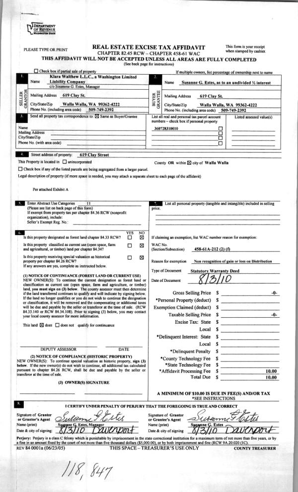 | 6 | 09/05/2006 | WARRANTY D | WARRANTY DEED | ESTES, SUSANNE G | KLARA WALTHEW LLC | | | | 111095 | 2006-10629 |