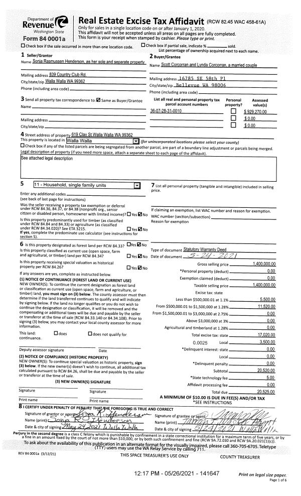 | 1 | 05/26/2021 | SWD | STATUTORY WARRANTY DEED | HENDERSON SONJA RASMUSSEN | CORCORRAN SCOTT & LYNDA | | | $1,400,000.00 | 141647 | 2021-06390 |