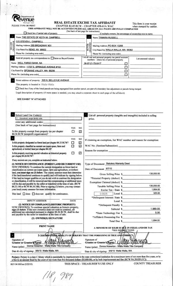 | Mailing Address: | 1605 MELROSE ST WALLA WALLA, WA 99362 | % Ownership: | 100.0000000000% |