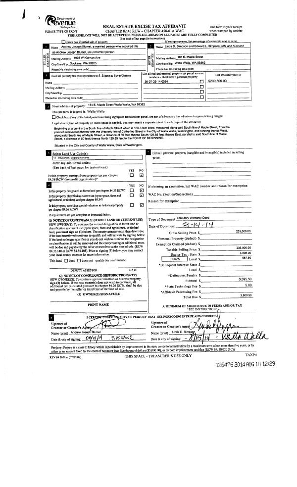 | 3 | 08/18/2014 | SWD | STATUTORY WARRANTY DEED | BLUMEL ANDREW JOSEPH | SIMPSON EDWARD L & LINDA D | | | $235,000.00 | 126476 | 2014-05971 |