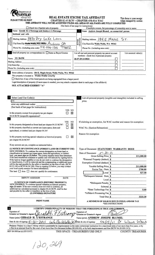 | 4 | 06/15/2011 | WARRANTY D | WARRANTY DEED | L'ESTRANGE, GERALD H & JESSICA | BLUMEL, ANDREW JOSEPH | | | $211,000.00 | 120269 | 2011-04650 |