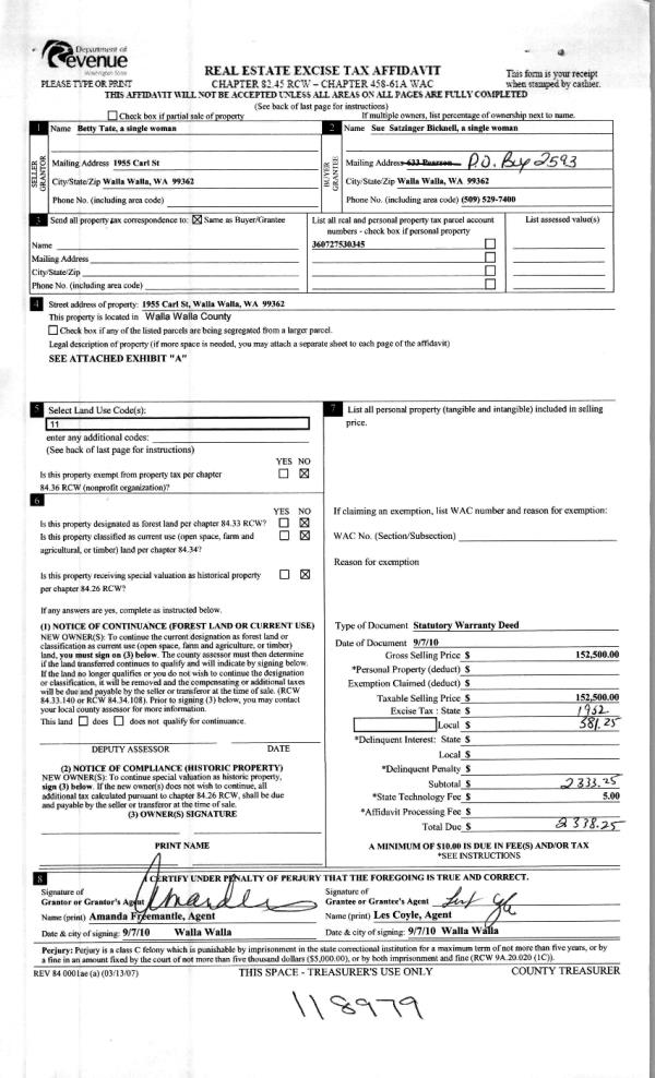 | 2 | 09/07/2010 | WARRANTY D | WARRANTY DEED | TATE, BETTY J | BICKNELL, SUE SATZINGER | | | $0.00 | 118980 | -118980 |