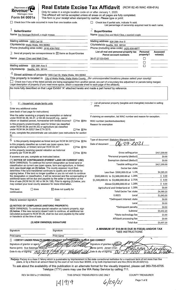 | 1 | 06/29/2021 | SWD | STATUTORY WARRANTY DEED | BICKNELL SUE SATZINGER | CHEN JERSEN & MEILI | | 2-PARCELS | $417,200.00 | 141919 | 2021-07902 |