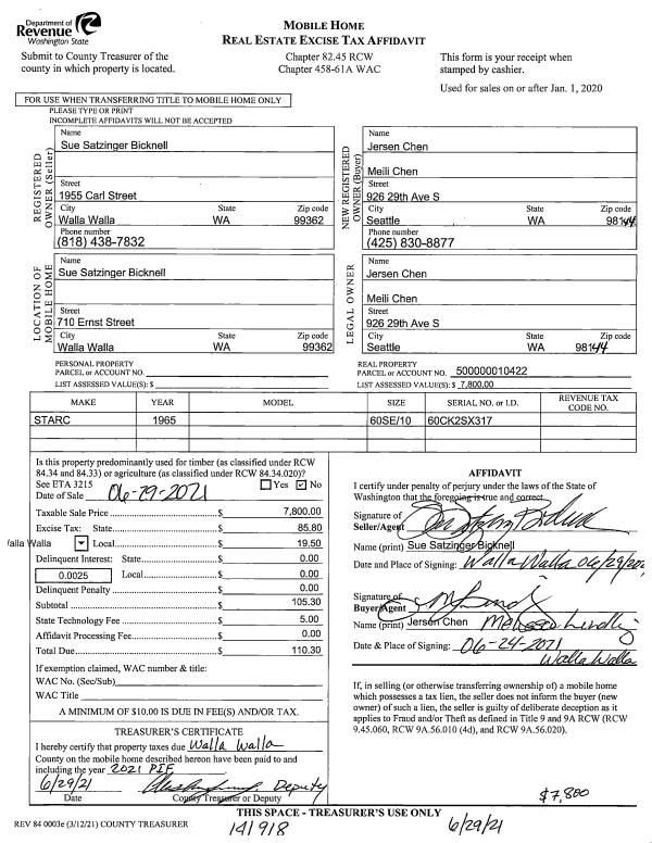 | 1 | 06/29/2021 | MH AFFIDAV | MOBILE HOME AFFIDAVIT | BICKNELL SUE SATZINGER | CHEN JERSEN & MEILI | | | $7,800.00 | 141918 | MHAFF-141918 |