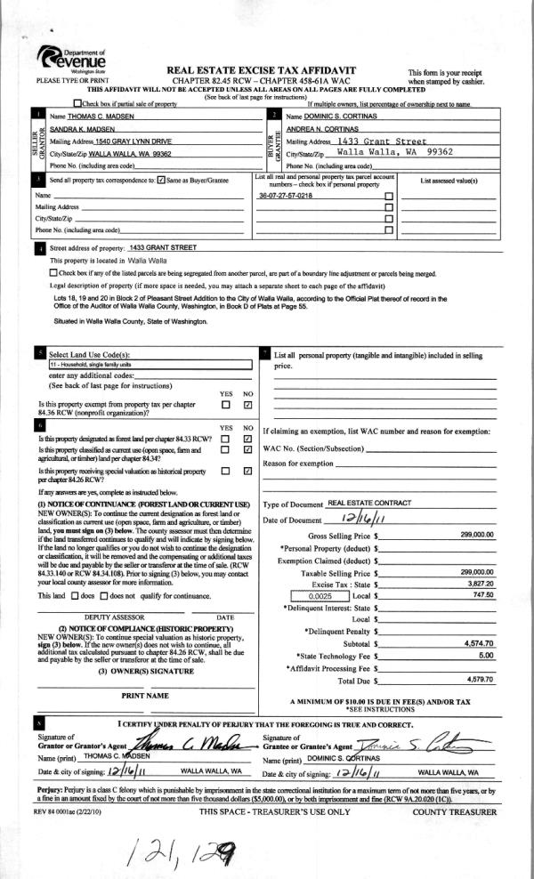 | 3 | 12/16/2011 | WARRANTY D | WARRANTY DEED | MADSEN, THOMAS C & SANDRA KAY | CORTINAS, DOMINIC S & ANDREA | | | $299,000.00 | 121129 | 2011-09889 |