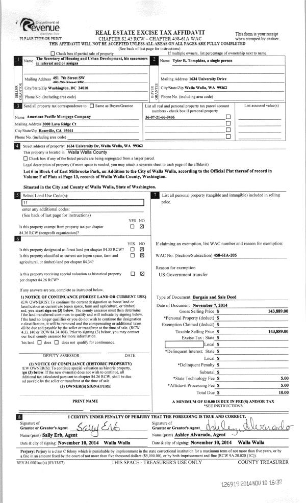 | 2 | 11/11/2014 | BARGAIN & | BARGAIN & SALE DEED | SECRETARY OF HOUSING & URBAN DEVELOPMENT | TOMPKINS TYLER R | | | $143,889.00 | 126919 | 2014-08197 |