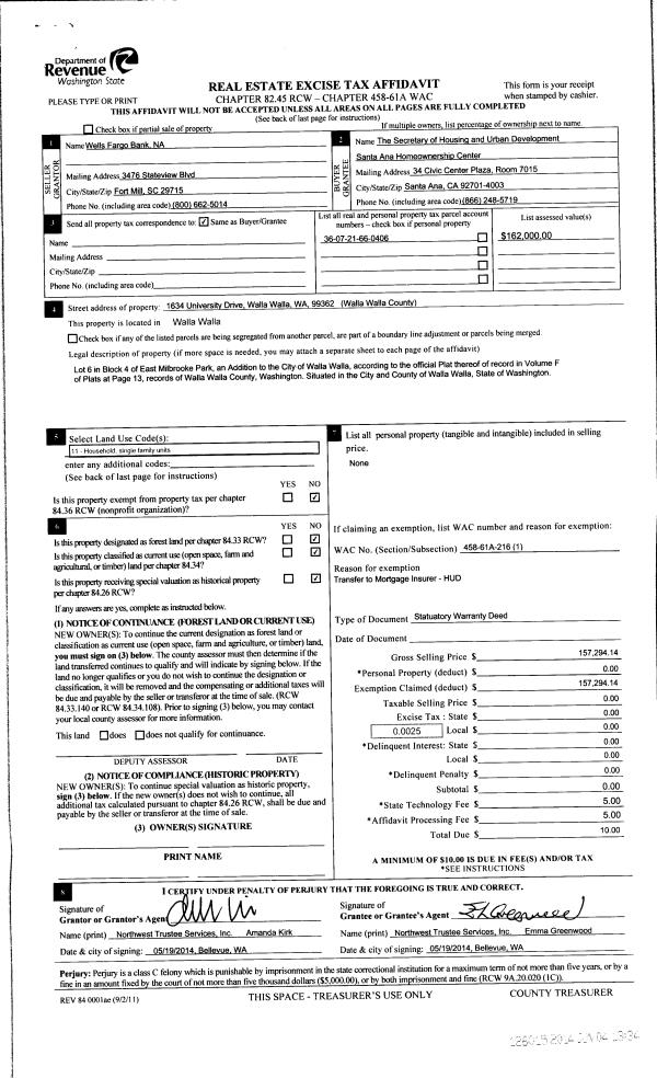 | 3 | 06/04/2014 | SWD | STATUTORY WARRANTY DEED | WELLS FARGO BANK NA | SECRETARY OF HOUSING & URBAN DEVELOPMENT | | | $157,294.00 | 126015 | 2014-03820 |