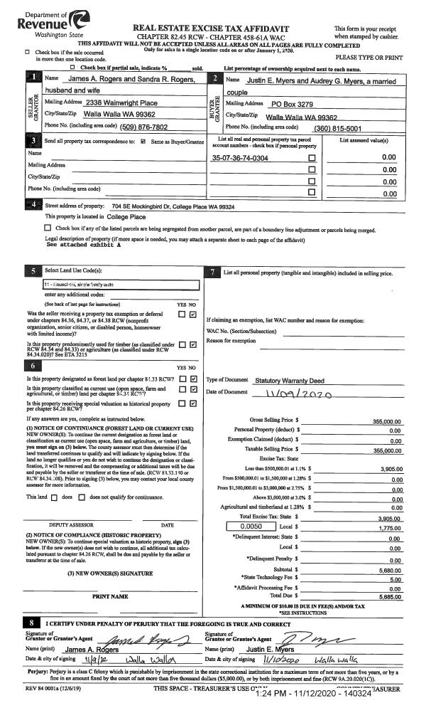 | 1 | 11/12/2020 | SWD | STATUTORY WARRANTY DEED | ROGERS JAMES A & SANDRA R | MYERS JUSTIN E & AUDREY G | | | $355,000.00 | 140324 | 2020-11926 |