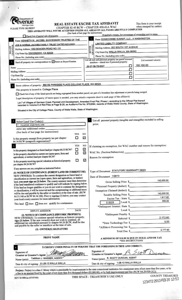 | 5 | 02/20/2013 | WARRANTY D | WARRANTY DEED | JACOBS, NORMA TRUSTEE | EDGECOMBE SUMMIT LLC | | | $142,000.00 | 123472 | 2013-01516 |