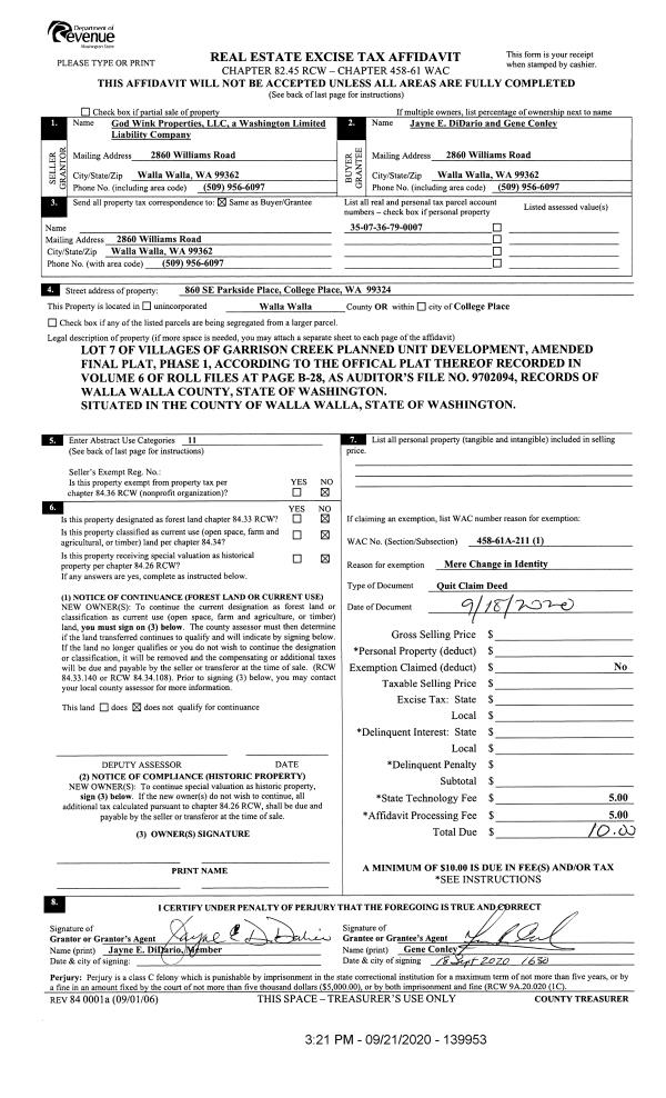 | 2 | 09/21/2020 | QCD | QUIT CLAIM DEED | GOD WINK PROPERTIES LLC | CONLEY GENE R & JAYNE E DIDARIO | | | | 139953 | 2020-09667 |
