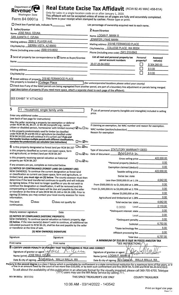 | 1 | 03/14/2022 | SWD | STATUTORY WARRANTY DEED | OZUNA JOSE R & SAN JUANITA | MANN LOGAN P III & JENNIFER LYNAE | | | $422,000.00 | 143542 | 2022-02110 |