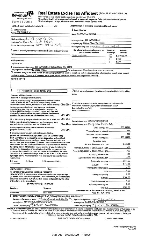 | 1 | 07/23/2025 | SWD | STATUTORY WARRANTY DEED | YBARRA DOMITILA RIOS | GUTIERREZ FABIOLA | | | $235,000.00 | 149721 | 2025-04238 |