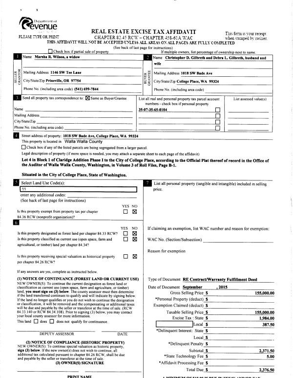 | 4 | 09/18/2015 | REAL ESTAT | REAL ESTATE CONTRACT | WILSON MARSHA R | GILBRETH CHRISTOPHER D & DEBRA L | | | $155,000.00 | 128847 | 2015-08193 |
