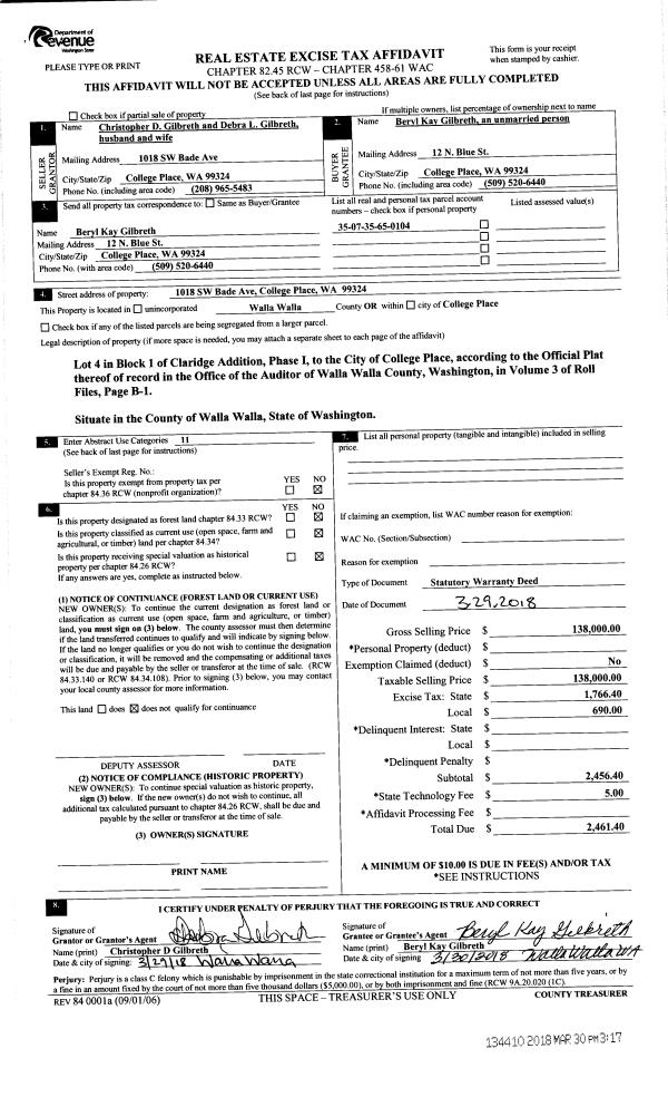 | 2 | 03/30/2018 | SWD | STATUTORY WARRANTY DEED | GILBRETH CHRISTOPHER D & DEBRA L | GILBRETH BERYL K | | | $138,000.00 | 134410 | 2018-02472 |
