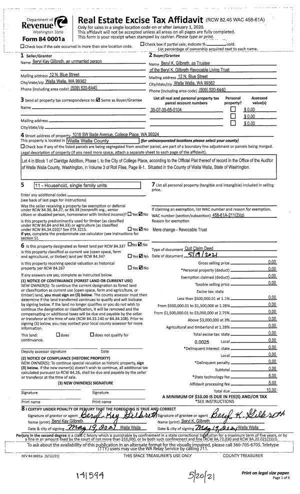 | 1 | 05/19/2021 | QCD | QUIT CLAIM DEED | GILBRETH BERYL K | GILBRETH BERYL K REVOCABLE LIVING TRUST | | | $0.00 | 141594 | 2021-06121 |