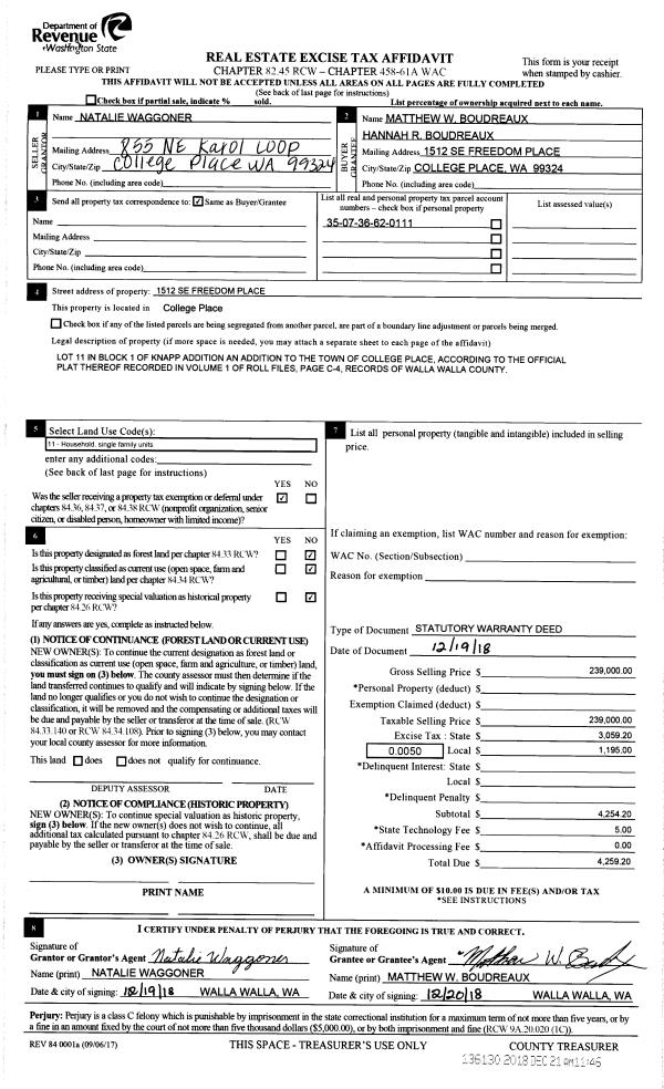 | 1 | 12/21/2018 | SWD | STATUTORY WARRANTY DEED | WAGGONER NATALIE | BOUDREAUX MATTHEW W & HANNAH R | | | $239,000.00 | 136130 | 2018-10540 |