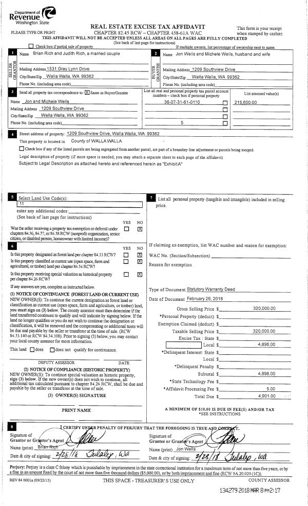 | 2 | 03/08/2018 | SWD | STATUTORY WARRANTY DEED | RICH BRIAN & JUDITH | WELLS JON & MICHELE | | | $320,000.00 | 134279 | 2018-01844 |