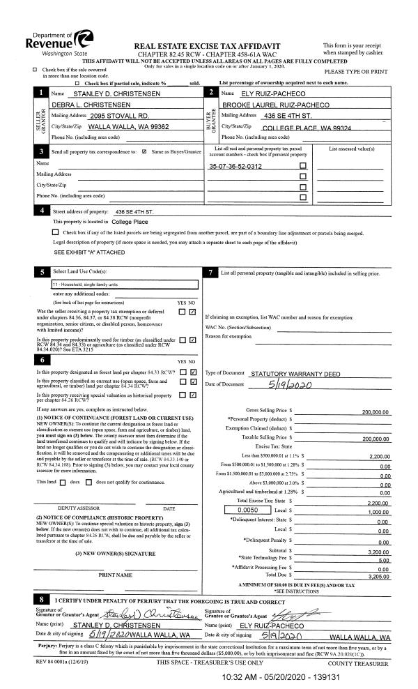 | 1 | 05/20/2020 | SWD | STATUTORY WARRANTY DEED | CHRISTENSEN STANLEY D & DEBRA L | RUIZ-PACHECO ELY & BROOKE LAUREL | | | $200,000.00 | 139131 | 2020-04395 |