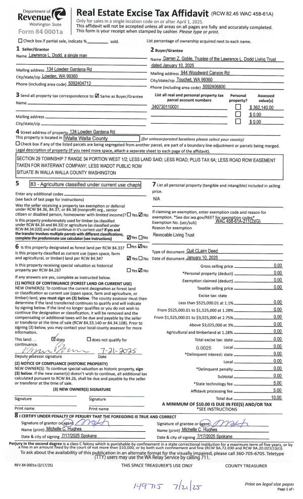 | Mailing Address: | 134 LOWDEN GARDENA RD TOUCHET, WA 99360 | % Ownership: | 100.0000000000% |
