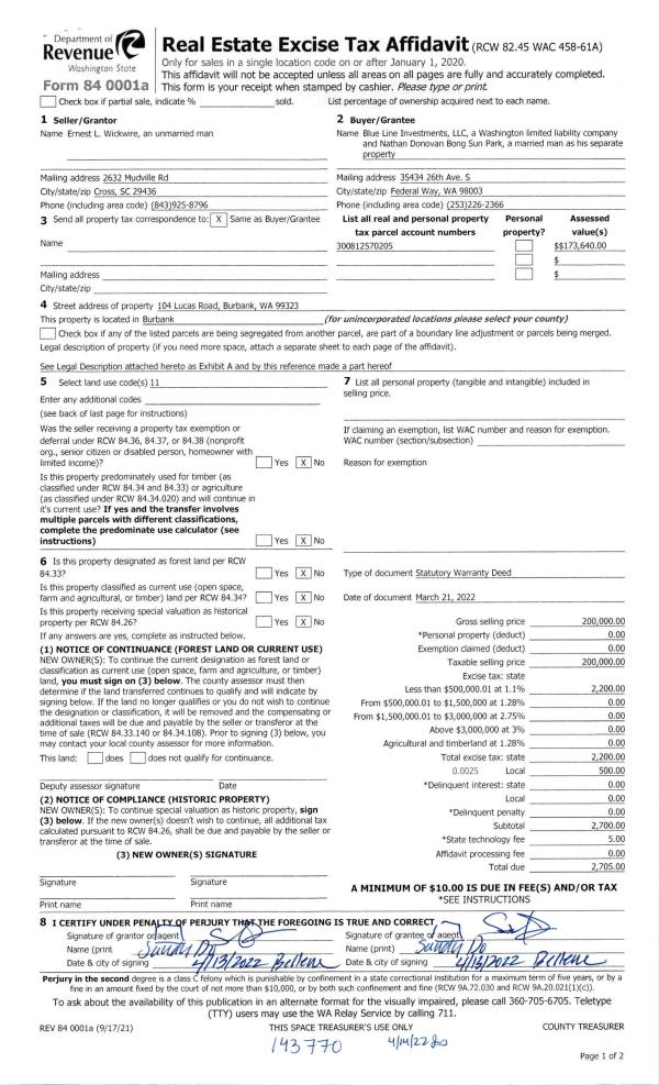 | 3 | 04/14/2022 | SWD | STATUTORY WARRANTY DEED | WICKWIRE ERNEST L | BLUE LINE INVESTMENTS LLC | | | $200,000.00 | 143770 | 2022-03166 |