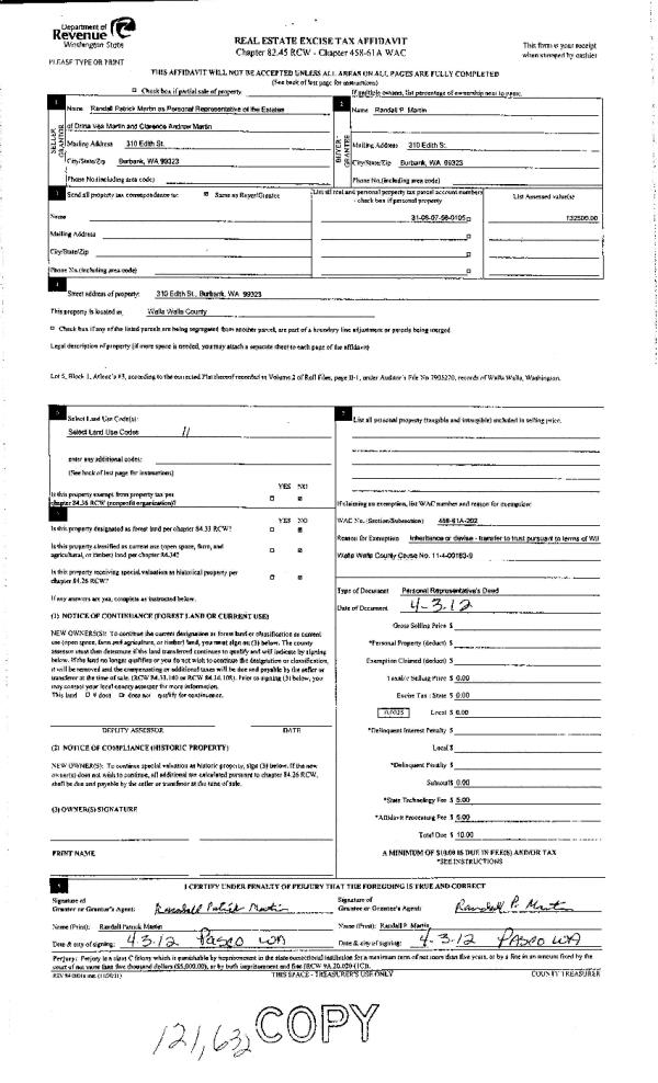 | 3 | 04/06/2012 | WARRANTY D | WARRANTY DEED | MARTIN, ESTATES OF CLARENCE | MARTIN, RANDALL P | | | | 121632 | 2012-02743 |