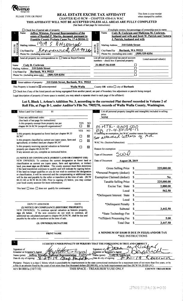 | 2 | 08/30/2019 | SWD | STATUTORY WARRANTY DEED | MARTIN RANDALL P ESTATE OF | COCKRUM CODY R & MAKINNA M | | | $225,000.00 | 137608 | 2019-06768 |