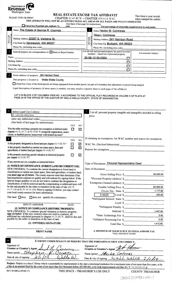 | 1 | 01/22/2019 | DPR | DEED OF PERSONAL REPRESENTATIVE | COOMES GEORGE R ESTATE OF | CONTRERAS HECTOR M & OLGA L | | | $92,000.00 | 136348 | 2019-00721 |
