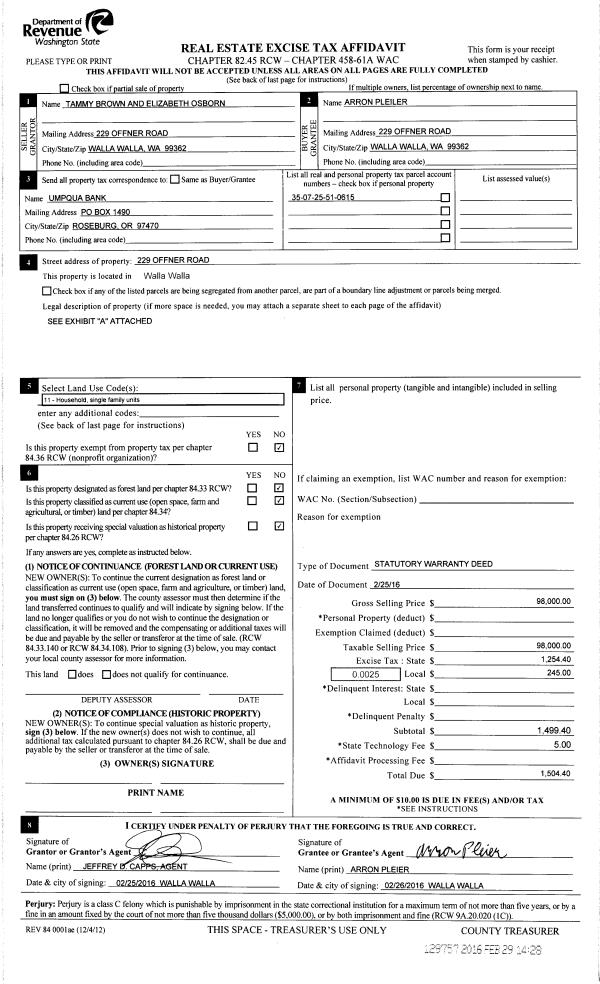 | 2 | 02/29/2016 | SWD | STATUTORY WARRANTY DEED | BROWN TAMMY LEE | PLEIER ARRON MATTHEW | | | $98,000.00 | 129757 | 2016-01529 |