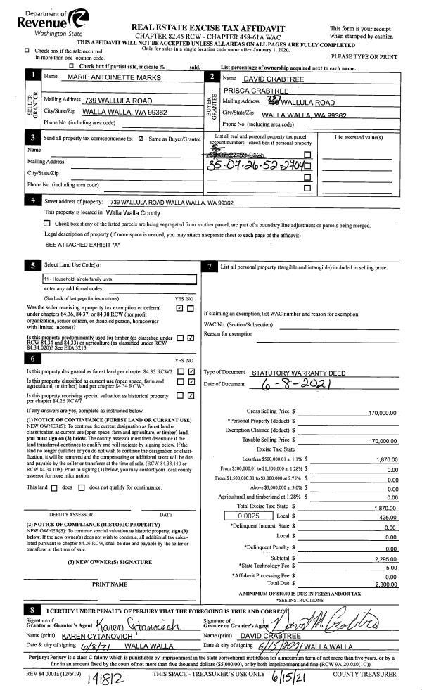 | 2 | 06/15/2021 | SWD | STATUTORY WARRANTY DEED | MARKS MARIE A | CRABTREE DAVID M & PRISCA | | | $170,000.00 | 141812 | 2021-07322 |