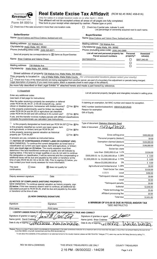 | 1 | 06/30/2022 | SWD | STATUTORY WARRANTY DEED | CRABTREE DAVID M & PRISCA | CRABTREE BRIAN & VALERIE CHASE | | | $196,000.00 | 144238 | 2022-05557 |