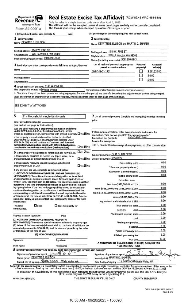 | 1 | 09/26/2025 | QCD | QUIT CLAIM DEED | ELLISON DEWITTE E | ELLISON DEWITTE E MARTIN D SHAFER | | | | 150098 | 2025-05863 |