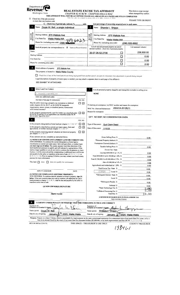 | 1 | 01/15/2020 | QCD | QUIT CLAIM DEED | BELL DOYLE W | SHIPPS SHANDA L | | | $0.00 | 138461 | 2020-00527 |