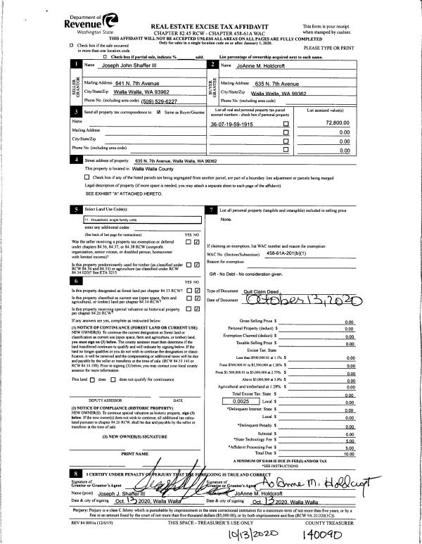 | 1 | 10/13/2020 | QCD | QUIT CLAIM DEED | SHAFFER JOSEPH JOHN III | HOLDCROFT JOANNE M | | | | 140090 | 2020-10580 |