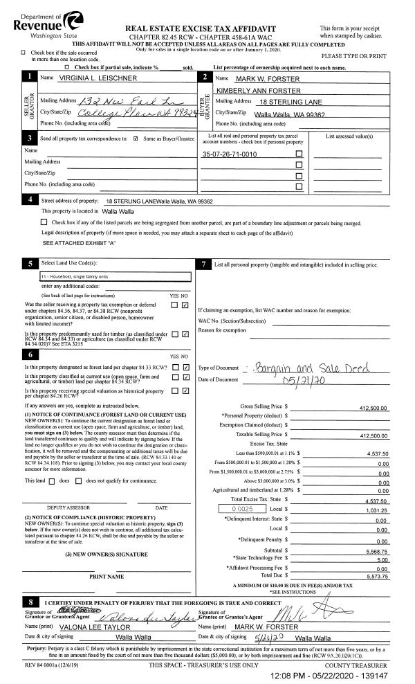 | 2 | 05/22/2020 | BARGAIN & | BARGAIN & SALE DEED | LEISCHNER VIRGINIA L | FORSTER MARK W & KIMBERLY ANN | | | $412,500.00 | 139147 | 2020-04522 |