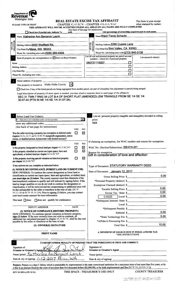 | 1 | 01/12/2017 | SWD | STATUTORY WARRANTY DEED | LASCH KATHERINE ANN BERGEVIN | SCHACHT WARD TRAVIS | | | $0.00 | 131795 | 2017-00571 |