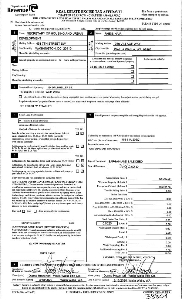 | 2 | 03/13/2020 | BARGAIN & | BARGAIN & SALE DEED | SECRETARY OF HOUSING AND URBAN DEVELOPMENT | HAIR RHEIS | | | $105,200.00 | 138804 | 2020-02355 |