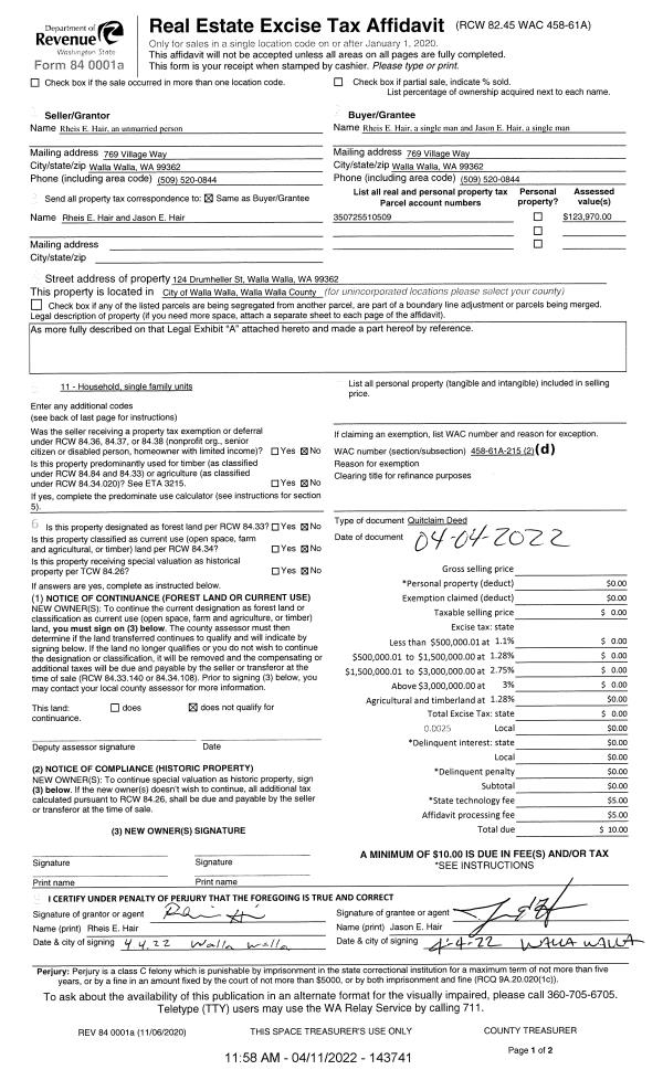 | 1 | 04/04/2022 | QCD | QUIT CLAIM DEED | HAIR RHEIS | HAIR RHEIS E | | | $0.00 | 143741 | 2022-02990 |